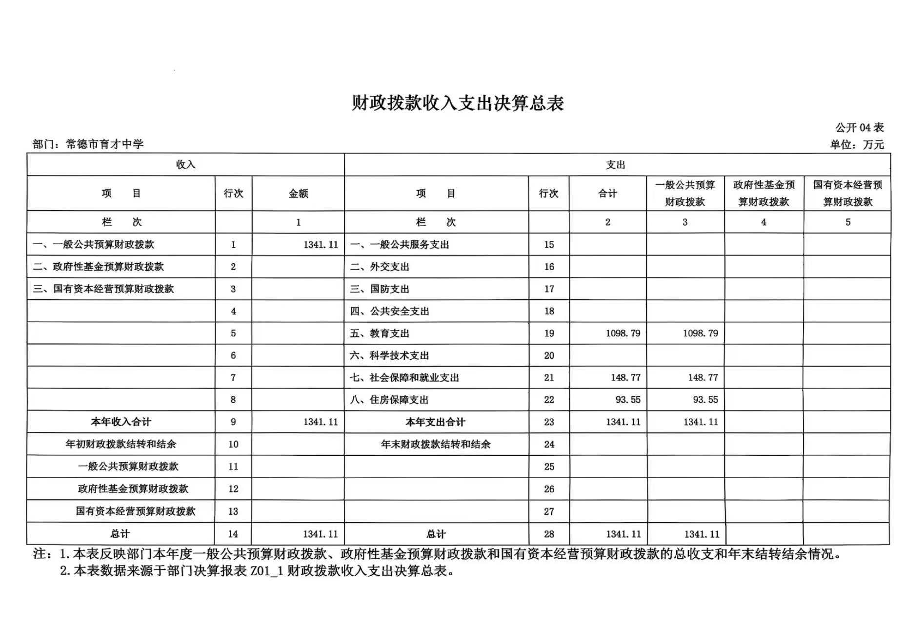 四、财政拨款收入支出决算总表